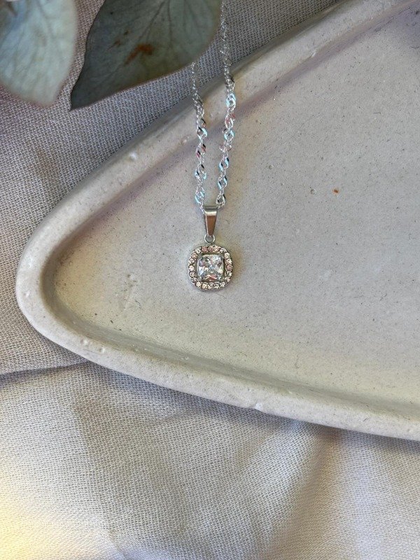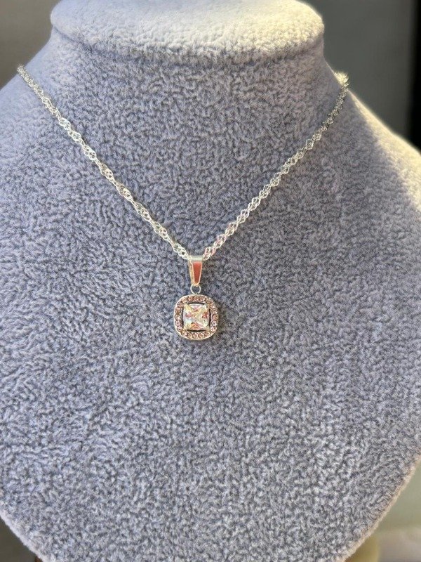 Cadena acero blanco con dije con cubic y strass cuadrado 40cm